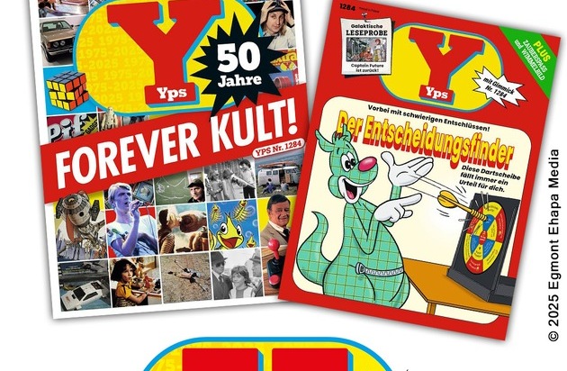 Und nun, ein halbes Jahrhundert später, erscheint dies beim Nachfolge-Verlag Egmont-Ehapa: Neben einer plastikgeschweißten Doppel-Ausgabe in unterschiedlichem Auftreten (und mit Entscheider-Dartscheibe als Gimmick, hier im Band S. 176 abschließend miteinander abgebildet) wartet der neue Yps-Verlag mit einem Sammelband auf: Ein Parforceritt durch fünf Jahrzehnte YPS-Historie in Etappen, ausgebreitet durch den Comic-Experten Volker Hamann.
