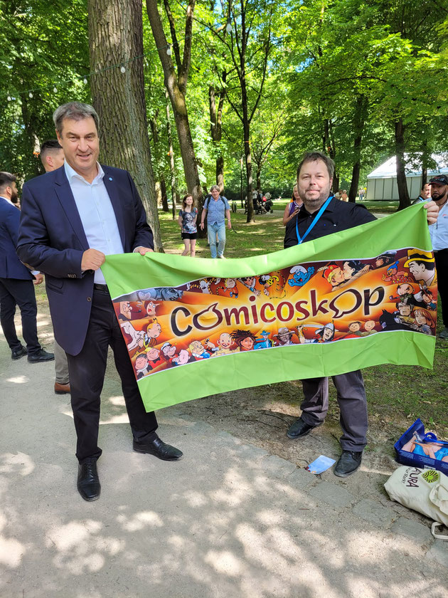 COMICOSKOP: Oh, das wäre fein! Denn es gibt ja viel Verbindungen in unterschiedliche Richtungen. Z.B.  gibt hier in Bayern unseren Ministerpräsidenten, der ganz stark sich immer mal wieder sehr wohlwollend äußert in Richtung Comics. COMICOSKOP-Chefredakteur Martin Frenzel hat jedenfalls Markus Söders Comic-Leidenschaft exklusiv fürs COMICOSKOP 2018 enthüllt, im Vorfeld des Comic Salons Erlangen 2018 ein Interview mit ihm geführt, als er gerade das Amt des Ministerpräsidenten frisch übernommen hatte Dabei stellte sich überraschend heraus, dass das Spiderman-Plakat nicht rein zufällig in dessen Nürnberger Wahlkreisbüro hängt, sondern dass dahinter eine große, immer noch tiefe Comic-Leidenschaft und -Kennerschaft steckt, dass sich Söder bestens auskennt, mit Comics im Allgemeinen, mit Vorliebe für den Williams Verlag / Klaus Recht, Marvel-Comic-Generation, Spiderman, Stan Lee/Jack Kirby, Steve Ditko, Johnny Romita & Co., aber auch als ein Teil der Generation ZACK…